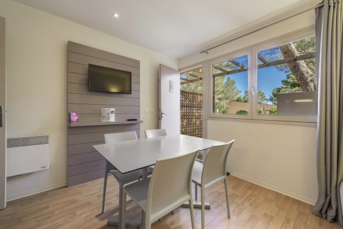 Vous profiterez également d’une terrasse intégrée à la partie « Champagne », offrant une vue dégagée sur le domaine et ses équipements : piscine, sauna et parc de loisirs.